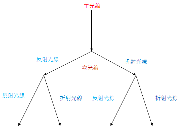 每一條主光線會產生(2^3-1)-1=6條次光線,