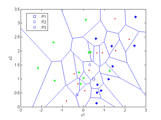 本來以為要自己寫程式來畫圖,沒想到MATLAB有內建函式可用,而產生出來的圖叫做Voronoi Diagram,在時間不多的情況下,當然要直接拿來用囉~話說我知道怎麼產生1-NN的圖,在兩兩point相同距離的地方產生邊界,在概念上相當簡單,但若要寫成程式碼,考慮的條件還頗複雜。先來看一下我想產生什麼圖形吧!