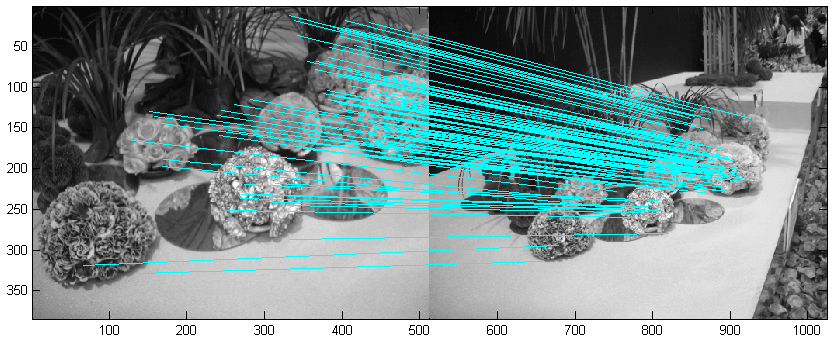 SIFT對於旋轉、放大、位移有相當大的容忍度,也就是說同一張相片單純只做旋轉、放大、位移,SIFT還是能夠match相當多keypoints。花2(遠距離拍攝)和花(近距離拍攝),則沒有上述那麼好的結果(只有match 107 keypoints)。