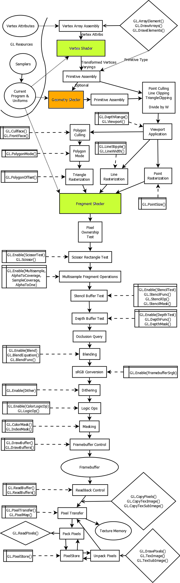 OpenGL本身是個狀態機,可藉由呼叫函式來控制各種狀態。話說OpenGL的pipeline真實版相當複雜,還有一些沒用過的函式。