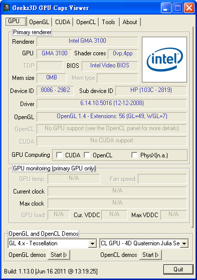 GPU Caps Viewer最新版本可以偵測OpenGL、CUDA、OpenCL三種GPU程式語言的支援狀況,對於研究電腦圖學的我,能知道所用電腦是否可以發展。然而在我想寫GLSL時,跑了最簡單的範例,居然顯示不支援,研究室的電腦是顯示晶片:Intl(R) Q35 Express Chipset Family。