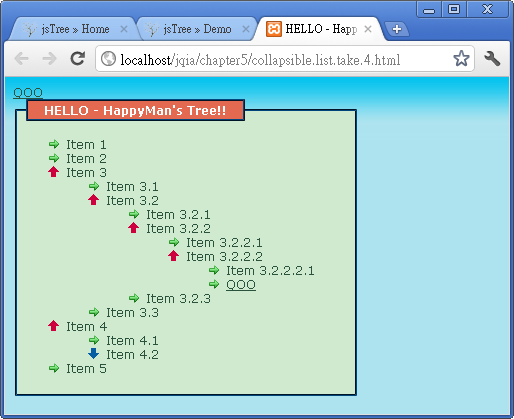 這不是大自然中的樹,而是網頁中表示頁面階層的概念樹。jstree設計的算是相當完善,修改一下http://www.jstree.com/demo中的範例樹,即可達成想要的效果,只要再設計介面一下,這一棵樹就能使用嚕~
