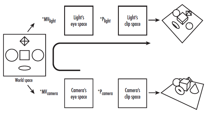 若場景中有一光源、一相機、一物體,分別對光源所見和相機所見繪出影像,先由前者(shadow map)紀錄影像pixel光源打到場景vertex的深度值DL,再由後者紀錄影像pixel中對應場景vertex其與光源的距離值DC,比較兩者的值,若DL<DC,則表示該場景vertex在陰影中,否則表示該場景vertex不在陰影中。
