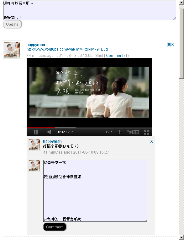 以下是我寫出來的留言系統,我修改Facebook Wall Script的程式,是不是跟真正的臉書塗鴉牆很像呢?哈~只差沒有「按讚」和「分享」功能囉!它有詳盡的教學,主管沒有要求的功能我也想寫出來呢!第幾留言數(右上角)、留言回覆數(Comment右邊)、留言時間和地點、幾分鐘(小時、天、月、年前)留言它已寫好,在檯面上沒有顯示出來的IP,可以在MySQL中一探究竟。我還用Elastic改了留言視窗,原本固定大小,隨著留言越來越長,右邊會出現「拉霸」,也可以從右下角拉大留言視窗,而我所修改的是,讓拉霸不再見!留言視窗會隨著你所留言的行數增加。