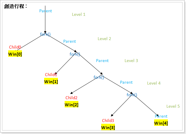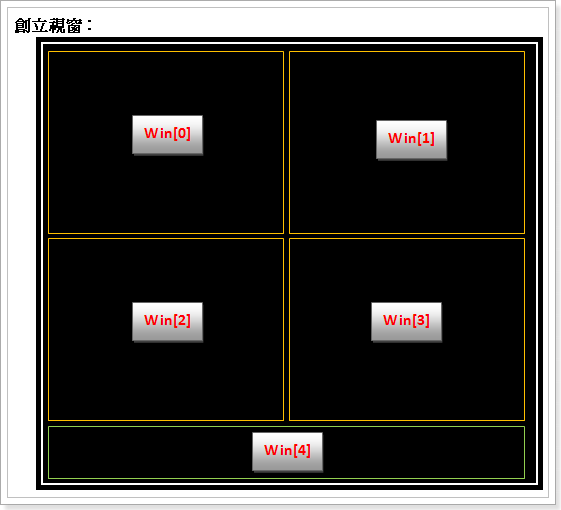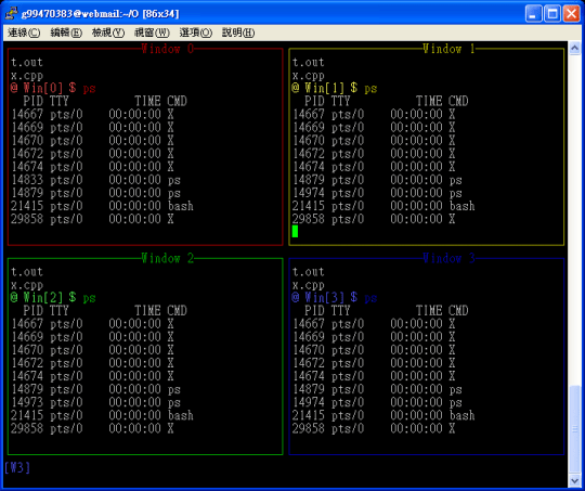 上圖為視窗安排方式,Win0到Win3為子視窗,主要視窗為Win4,主要來偵測鍵盤訊號以及子視窗的顯示。此外,我再創立四個視窗,專門來為Win0到Win3畫邊框的視窗,使得邊框獨立,不會因為子視窗更新內容而破壞邊框。