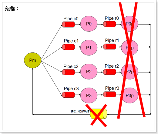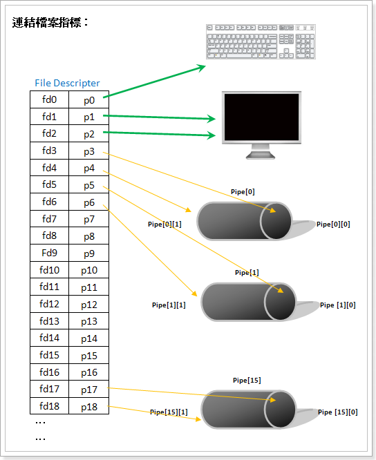 利用陣列儲存各字元,接著write()寫入管線,由另一程序read()讀取各字元,放入陣列後,執行system(),來達到目的。寫入可一次寫一整行,而讀取一次只讀一個字元,此時使用spinlock來判斷是否有字元可以讀取。