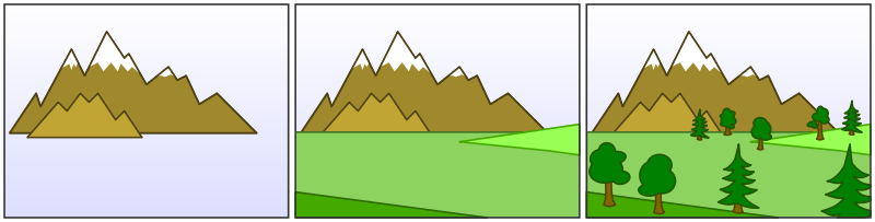 當投影3D物體到2D屏幕上,必須決定哪些幾何可見而要被畫出來,而哪些幾何不可見而要被隱藏起來。畫家演算法(Painter’s Algorithm)先將幾何從遠排序到近,再依遠近順序畫出幾何,可以從這一張圖看出原理: