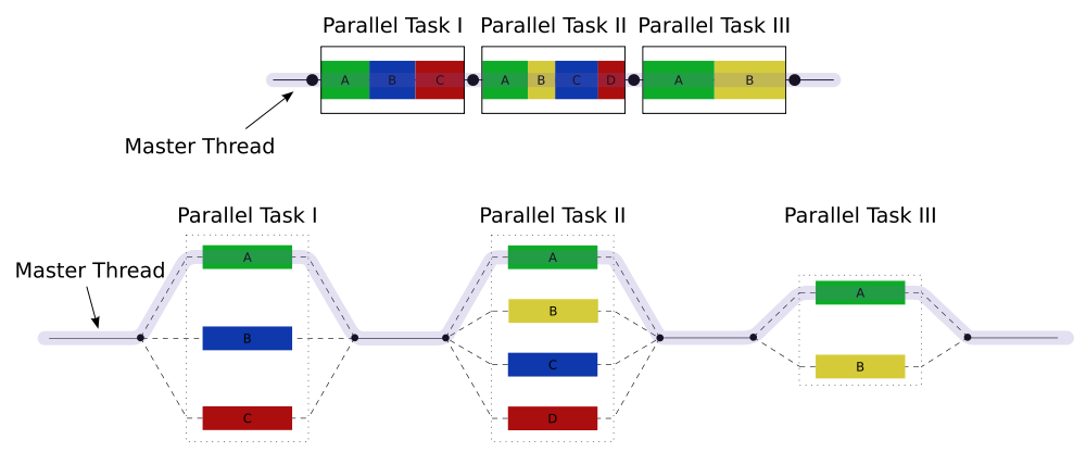 上圖上半部份表示1個job分為3個task,只用1顆核心執行,下半部份則依task的需求分成3顆核心、4顆核心、2顆核心來執行。若演算法適合平行化,想必效能會有所提昇!