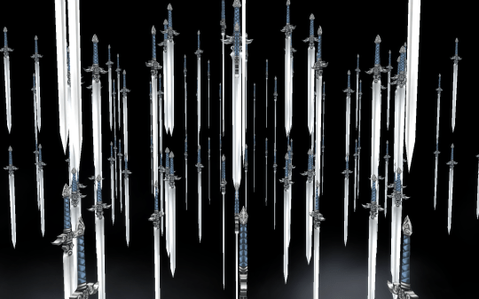 萬劍訣果然還是很令人震驚,我好奇的是雲凡明明拿雙劍,雙劍的長度大約是單鍵的三分之二長,他施展萬劍訣時出現的這一把劍不知道是怎來的?難道雙短劍合而為一成單長劍!?整個動畫大概是:長劍現身,在雲凡前頭轉一圈,隨後衝向天際,長劍在天空中一分為萬,主要的長劍引領其它幻化出來的長劍,垂直往地面插下!
