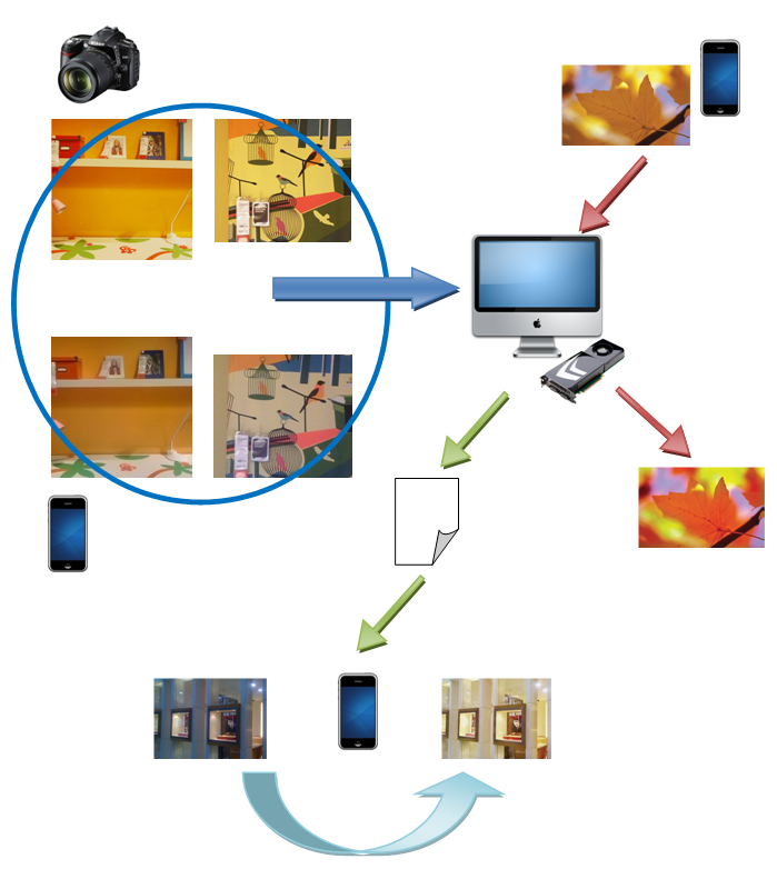 我的想法:paper實做1 to 1的mapping,我們可以做all to 1,也就是所有低階相機對應單一高階相機的mapping,paper表明trainning stage需要十多張數十萬像素的相片來做訓練,image registration時我們可以平行化加速trainning stage,獲得color and tone mappings之後一旦有新的相片進來,做image style transfer時也可以平行化加速image enhancement。將來可以做到相機上去,即時讓剛拍的影像做image enhancement,像是使用相機功能中的情境模式那樣來拍攝,彌補低階相機色彩失真、對比誤差、雜訊、曝光誤差等缺點,尤其是在手機上,雖然智慧型手機中的相機已經做到相當高的畫素,然而在品質上卻遠不及高階相機如DSLR。