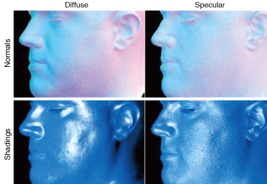 在拍攝人臉時,可以同時對人臉打上不同的光照,並利用硬體設備把反射到攝影機的光來源分成散射反射與似鏡面反射,就可以模擬出粗糙皮膚跟油脂皮膚的材質,以及其幾何性質。最後再把這兩種材質的皮膚合成,所做出來的人臉模型就非常逼真了。