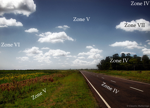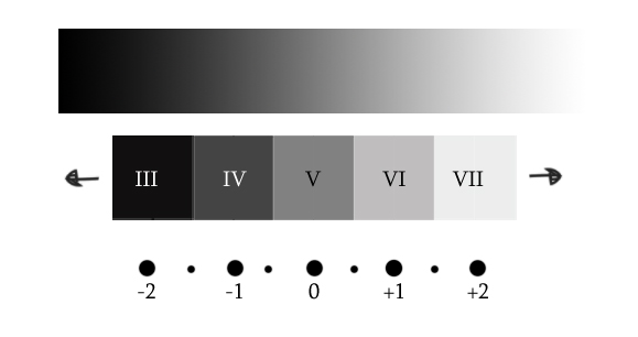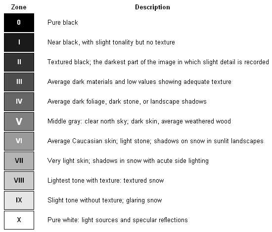 #Zone System的簡介:Zone System是一種攝影技術來決定底片的曝光和暗房的處理,是由Ansel Adams和Fred Archer所制定。Zone System的主要概念是把影像的場景分成10個區域 (變異:9個或11個亦可),每個色調範圍都可以被分到其中一個區域,中間調的區域為V (5),有著18%的反射率。對於數位攝影師而言,我們最關心的是從III (3)到VII (7)的色調,I (1)和II (2)被歸類為曝光不足,VIII (8)和IX (9)則被歸類為曝光過度。