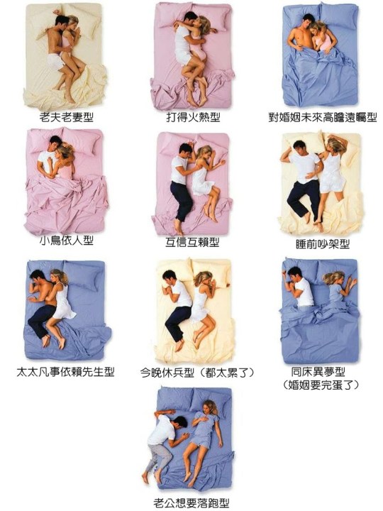 […] 剛看到一張非常值得思考的圖,想起之前寫了從睡姿看個性 (Sleeping Position Gives Personality Clue),說到一個人怎麼睡會透漏出他(她)什麼樣的個性,非常有意思!雖然有點臉紅心跳,文章下方還是貼了一張夫妻間的睡姿,讓我們來重溫一下從夫妻睡姿看關係 (Relationship Between Husband and Wife from Sleeping Position)。 […]