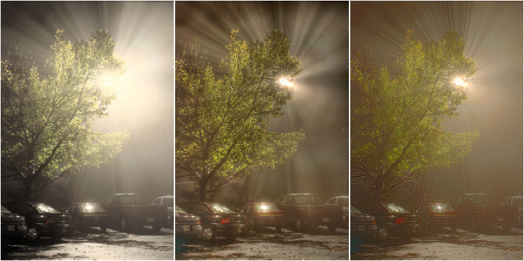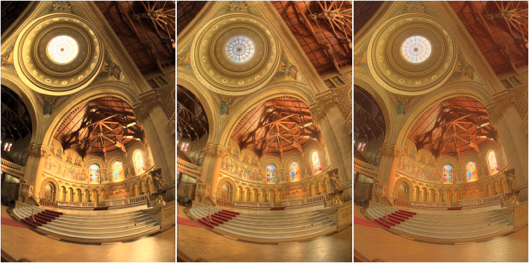中間是此方法得出的影像,明顯比左Ward Larson(1997)右Tumblin(1999)兩者好!超亮和超暗的細節保留得比較好,亮度變化平滑均勻。左邊影像明顯有曝光過度和曝光不足,而右邊影像有顆粒狀材質感且不像真實相片。