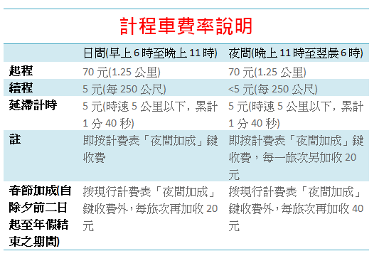 跟搭公車和捷運一樣,一上計程車基本費70元,之後隨著續程數和延滯計時數的增加而跳表,跳一次表以5元計算。