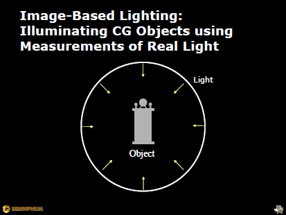 這裡就要解釋Image-based lighting,是3D繪圖技術,牽涉捕捉全方位真實世界的表現當作影像來源,通常會使用專業的攝影機。接著這影像會投影到圓屋頂(dome)或球體(sphere),類似環境映射(environment mapping),而且可以用來模擬物體在場景中的光照效果,使得真實世界中高度細節的光照能照亮場景,而非使用現有的繪圖技術來精確地建立光照模型。