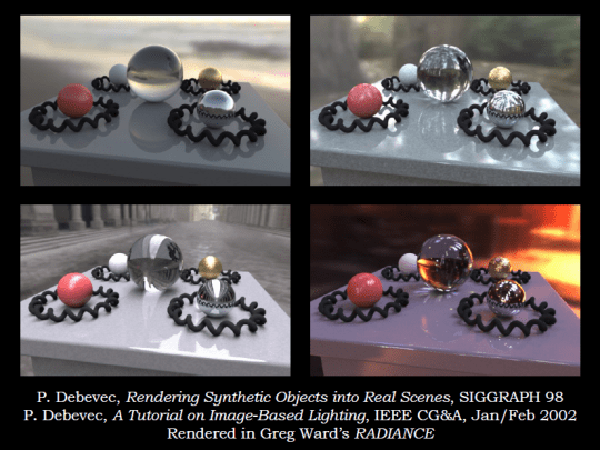 讓環境光紀錄成影像的技術叫做Light Probe Imaging,會使用High Dynamic Range Lighting Environments。這裡先介紹使用鏡射球(mirrored ball)來捕捉環境光(可點圖放大)。