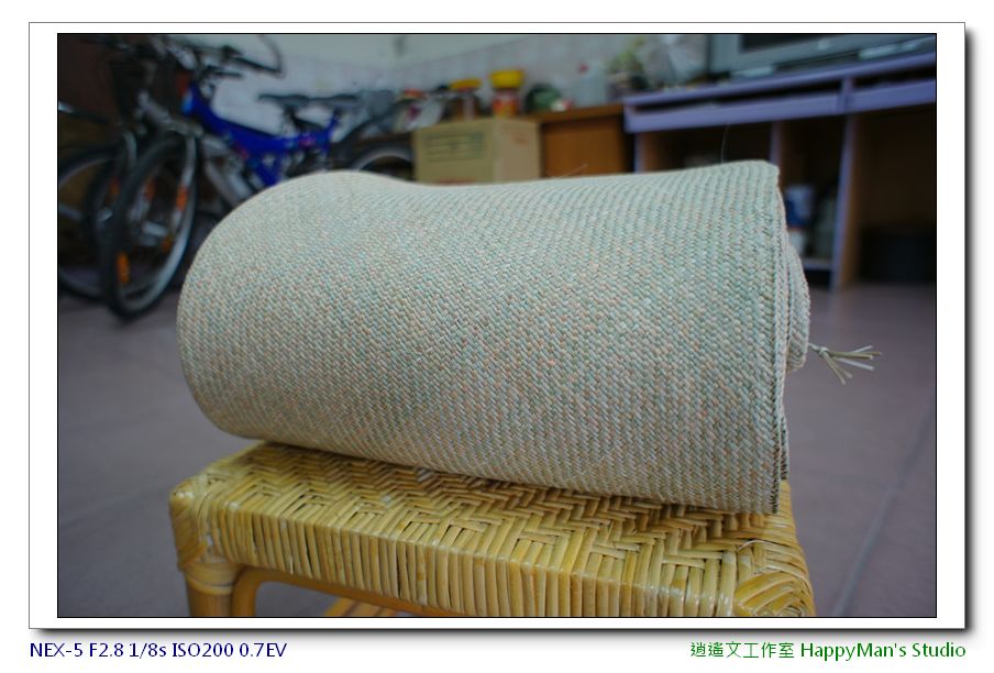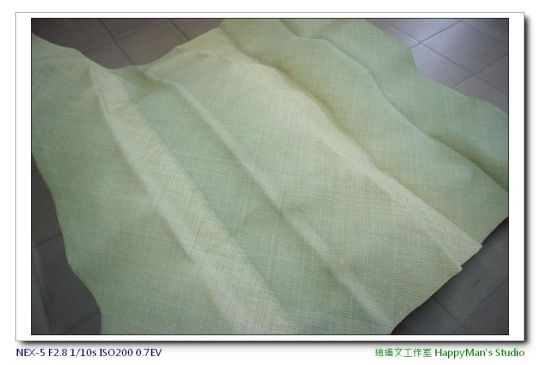 開始來介紹囉~這是外婆最近幫人家做的大甲草蓆6尺X6.2尺1尺=33.33公尺,因此可以換算成1.9998公尺X2.0665公尺,面積約等於4平方公尺。圖中有標示拍攝時相機的設定,可供對影像比較敏感的人做參考。有幾張影像「故意」重複,是以HDR效果拍攝,期望能完整呈現草蓆和草帽的細節,點圖放大可看紋路細節。