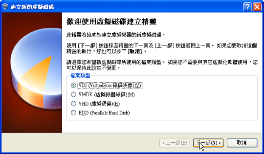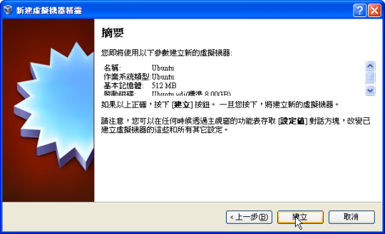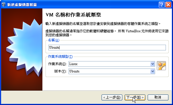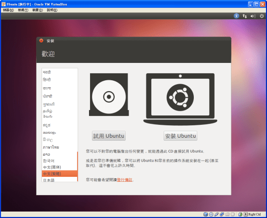 儘管我下載的Ubuntu是.iso檔,VirtualBox支援直接以.iso檔安裝,不需要額外如alcohol、daemon等掛載映像檔軟體掛載.iso檔即可安裝!而安裝過程相當簡單,不斷地按下一步也是沒有問題。