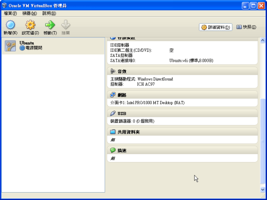 最近想要架設server,所以先來玩virtual machine。之前在Mac Book Pro上玩過VMWare,因為不熟悉iOS的操作介面,因而透過virtual machine來使用Windows XP,但這可不是我願意將就,於是在此我要安裝免費的Linux作業系統Ubuntu,以資訊賴以維生的我,飾必得要精通各式各樣的作業環境,其實是出自於我的好奇心與對資訊的渴望,所以既然有免費的虛擬電腦模擬軟體VirtualBox,那我就馬上下載來玩玩囉~