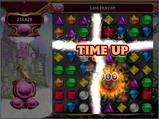 寶石方塊 (Bejeweled)在瀏覽器Chrome上有兩種模式,一種是盡可能地消除寶石到無法再消,遊戲就結束,另一種是盡可能在有限時間內(起初只有一分鐘)消除寶石。我個人喜歡後者,為什麼呢?因為爽度!這也就是為什麼我喜歡這款遊戲的最大原因。你若實際玩過計時模式,你將會發現寶石時常會給你驚喜,掉下來之後又馬上被消掉的機會比一般模式還要高。這時候你若眼明手快的話,在消掉此處寶石的同時馬上又去消掉它處寶石,會加速遊戲步調,讓連爆的機會大幅提昇!這時候你就會慢慢地往高潮走去,你將發現時間怎麼變慢了,迫不及待要移動下一顆寶石!這是我玩了之後觀察到的現象。