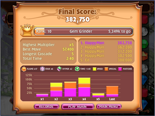 我在想若在智慧型手機或平板電腦上玩,效果會更好!因為個人電腦你只能操作滑鼠,鍵盤沒啥作用……要是能雙手並用,一支手移動寶石,一支手點選提示,這樣子操作就十分有效率!我已經玩了兩個模式好一陣子,也把預設紀錄給推翻掉!我在想若能寫一個按鍵精靈,用程式判斷移動哪一步會是得分的最佳步,那麼紀錄一定會節節攀升,訓練自己寫程式破解遊戲也是一種娛樂呀!未來我要試試看~