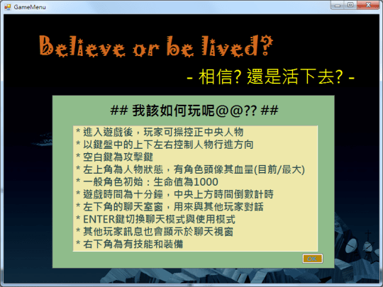 這是上學期大三學弟妹們的軟工成果:相信還是活下去 (Believe or be Lived)。是用C#所寫成!阿雅負責介面設計,畫面還滿精緻優美,經她同意後,我很高興地分享她的作品給大家。