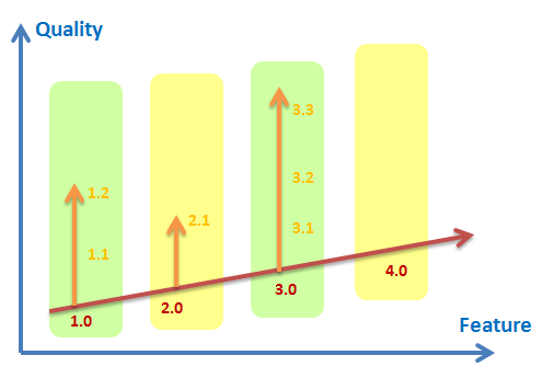 版本更新有幾種作法,一是奇偶兩組人馬交替做(1、2、3、4……),二是新版和子版兩匹人馬負責(1.0 1.1 1.2、2.0 2.1、3.0 3.1 3.2 3.3、4.0……),通常工程師喜歡做新產品,所以可能會給做子版本的工程師多點報酬,來平衡替人家擦屁股的不平衡。看我畫的圖比較好理解:
