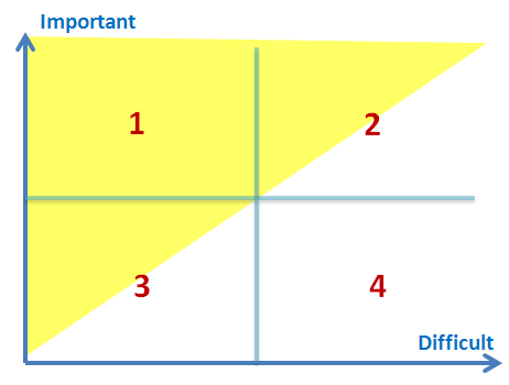 - 需求定義:你怎麼知道他們喜歡什麼?把事情做對vs做對事情,問題有兩個性質,簡單/困難與重要/不重要,做對事情就是做簡單且重要的事!然而執行長觀察到,通常工程師著重在感興趣的問題上,就會去做困難的問題!而在艾爾科技他督促員工做1、2、3象限。如圖所示: