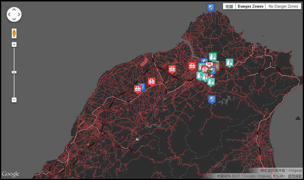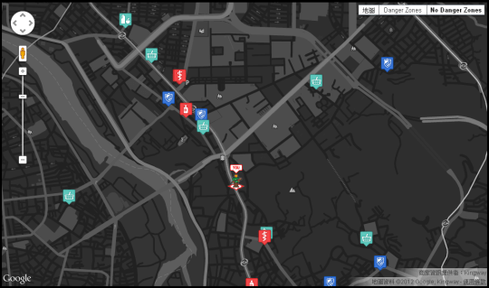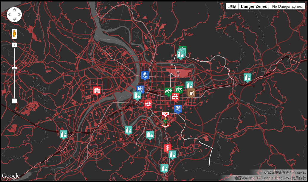 繼四月初google推出八位元地圖(8 bit map)後,又有很閒的工程師做了殭屍存活地圖 (Zombie Survival Map),感覺只是改變主題特色,其餘的地圖資訊沒有太大的改變,第一次看到這種黑暗地圖真會讓人又驚又喜呢!