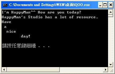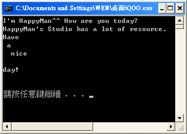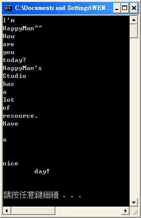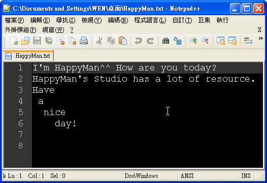 讀檔其實有幾種方法,在這裡我用一次讀取一行的技巧來讀取檔案裡的資料。我準備一個檔案叫做:HappyMan.txt,裡頭有這些字元~