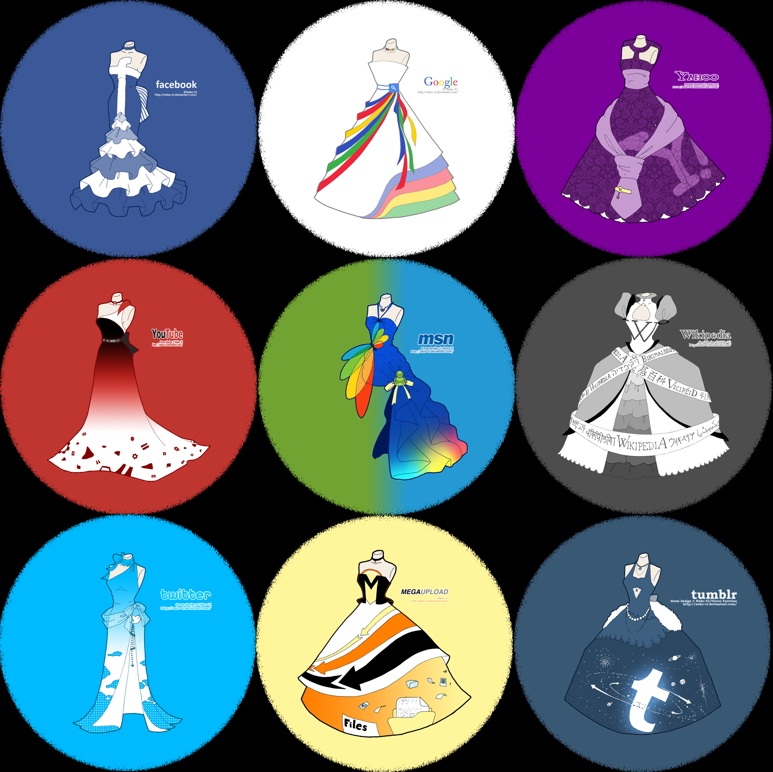 這張圖介紹Facebook、Google、Yahoo、Youtube、Msn、Wikipedia、twitter、megaupload、tumblr,藝術家將Logo配色表現在禮服上。