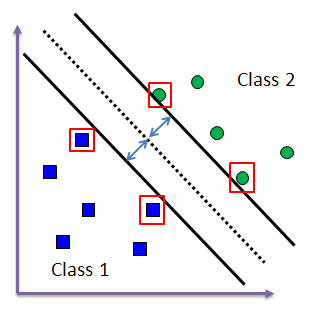 首先我們想知道為什麼這個技術要叫做支持向量機器 (Support Vector Machine),而其中支持向量 (Support Vector)是指在訓練資料集 (Training data set)中,用於分類上給予最多資訊的點,其會落在如圖中所示的紅色框起來的資料點。