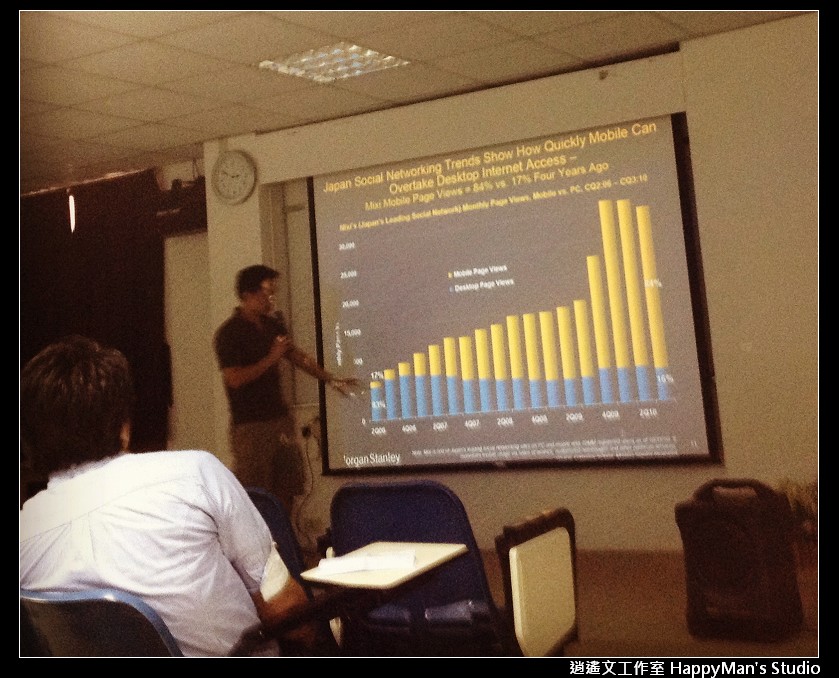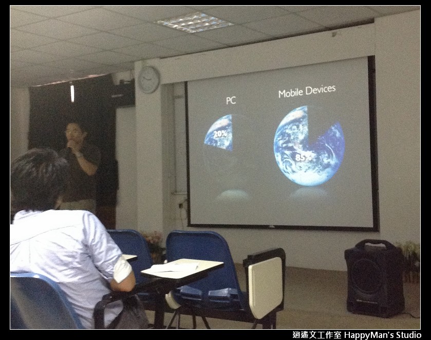 陳在演講一開始放了好幾張PC、NB、SP(Smart Phone)、OS、APP等此消彼長的數據圖,可以很清楚地發現mobile device影響力不斷地擴大。我們會以為使用PC的人應該還比使用Mobile Device的人還要多吧!?但事實上完全相反,畢竟PC是固定在室內才能使用,而MD可以帶著隨處遊走,可見SP還有很大的成長空間,這也使得PC的市場逐年萎縮。以行動作業系統來看,目前還是Android和iOS兩陣營在互別苗頭。由於SP方興未艾,APP所產生的經濟效益與日俱增。