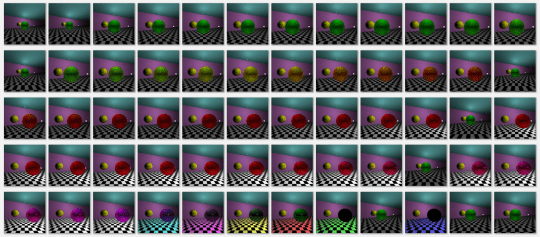 想要將上圖以平順的動作變換到下圖,該怎麼作呢?我總共算圖60張,由於版面有限,我將這60張光線追蹤 (Ray Tracing)的圖濃縮到一張。(點圖可放大)