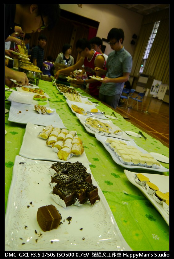 12點15分時間一到,我們偉大的系主任李哥開啟交接儀式,不像傳統活動的開場白,李哥輕鬆愉快地說了幾句話,最後一句「盡情地吃喝吧!」手跟著往大家後頭一比,看到什麼?所有人馬上跑到後方搶食~