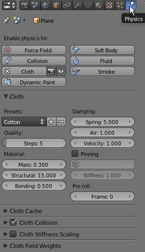 讓Plane擁有物理性質,右方介面Physics,點選Cloth,設定如下: