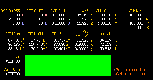 我從這兩個網頁(Color calculator、CIE Color Calculator)計算如上圖純綠色RGB(0, 255, 0)到Lab色彩空間,但出現不同的結果……