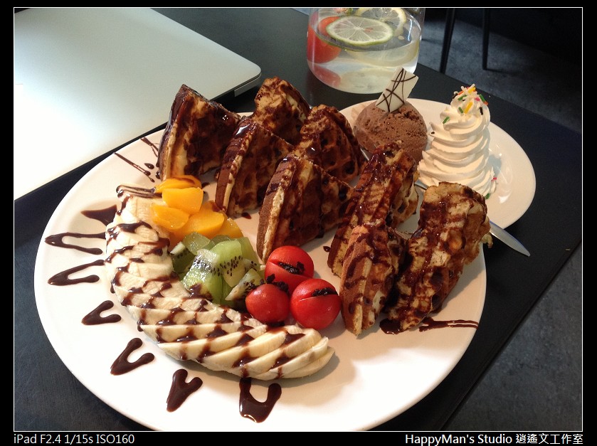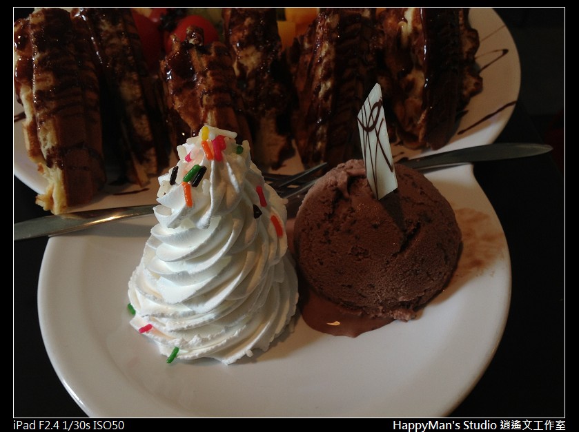 吃完奶昔當早餐的我,現在想吃午餐點心,於是點了這盤水果鬆餅加巧克力奶油冰淇淋!
