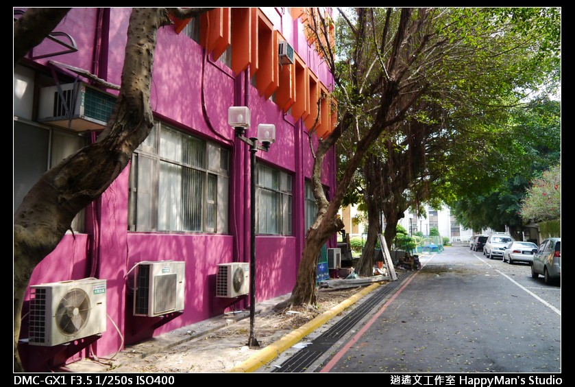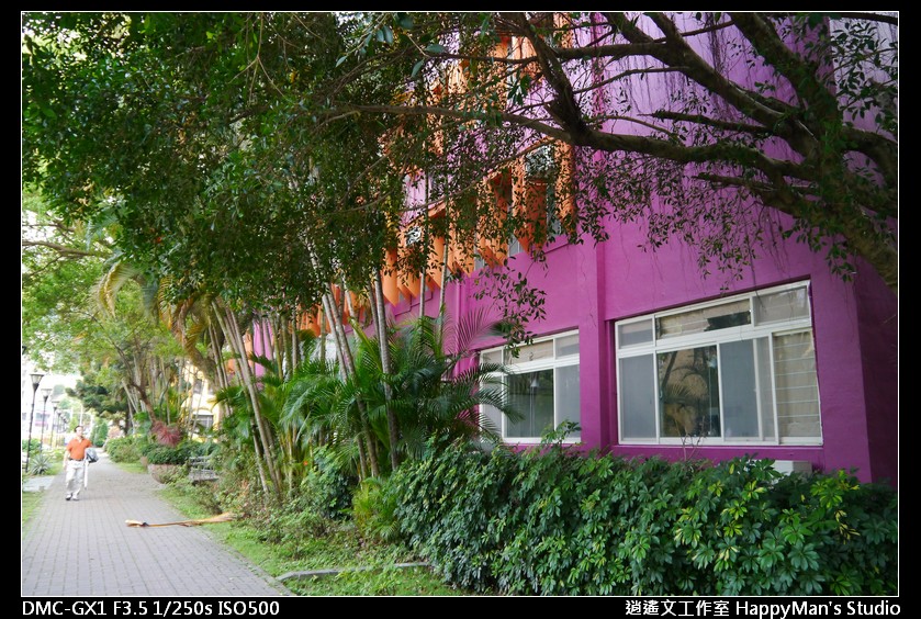 粉紅建築物包圍著綠意,讓順道經過的人慢下腳步~停在一旁的車子不再顯得紊亂。