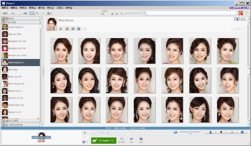 有個程式設計師特地分析這20個美女,校正每張臉的位置到一模一樣,這是把他實驗用的校正過影像放在Picasa的樣子: