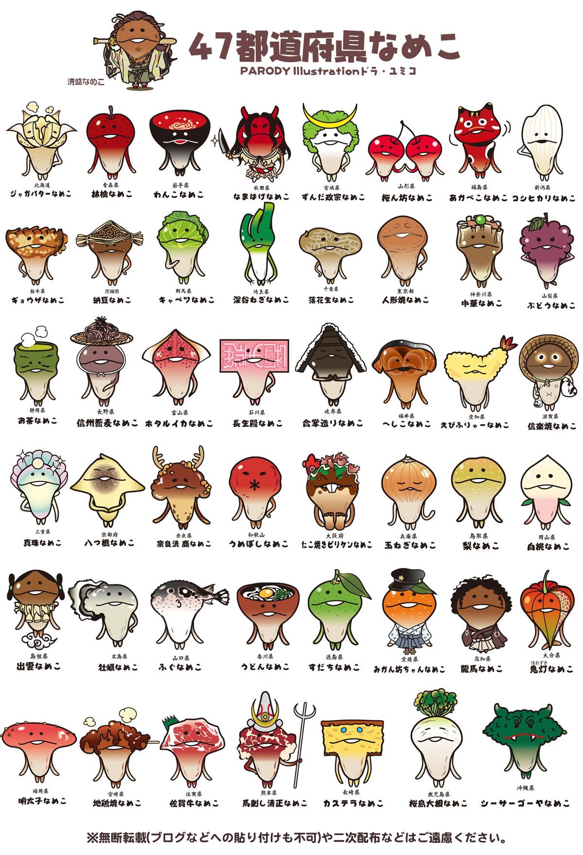 臉書上時常有些分享,看到有關方吉菇菇的介紹真讓我大開眼界,就是這張圖日本47都道府県代表菇~