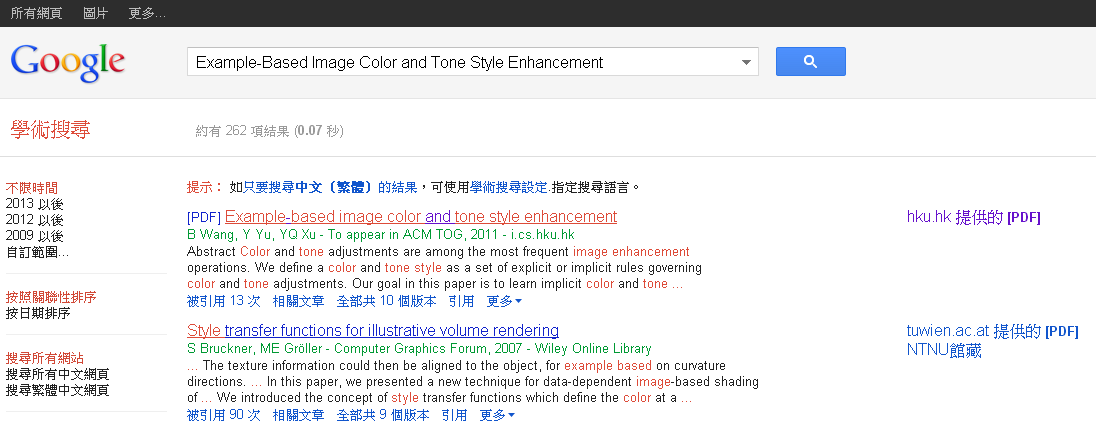 真是感謝Google學術搜尋,讓我可以輕易地找到正在研究的相關論文。它所提供的功能還有很多可以挖掘呢!我們都要站在巨人的肩膀上,如此可以爬得更高看得更遠,讓這世界更加美好~