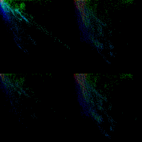 放大看某區域部份色彩空間,擷取映射表(原始影像的映射表和強化影像的映射表)左上方512*512區塊且沒有壓縮為破壞性的JPG檔,依然是非破壞性壓縮的PNG檔,以查看非空洞點實際分佈情況。