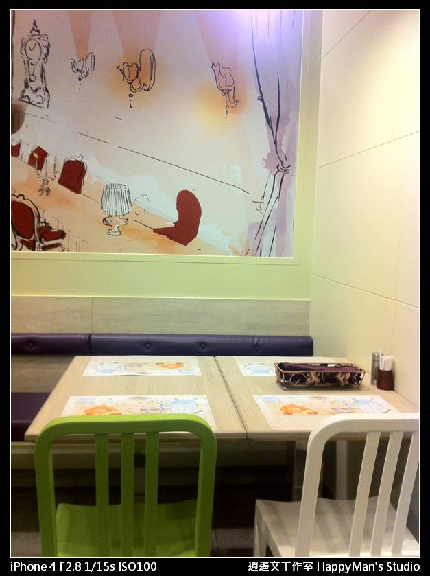 椅子擺放顏色很特別,三張白色和一張綠色,綠色是代表主位嗎?呵呵~