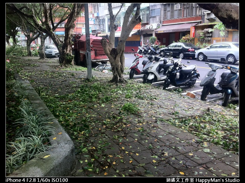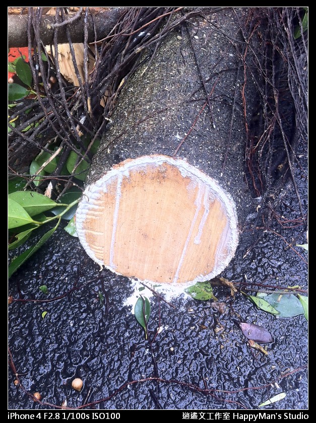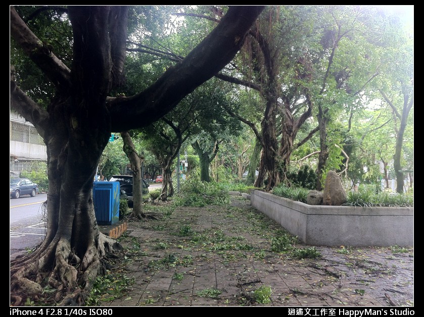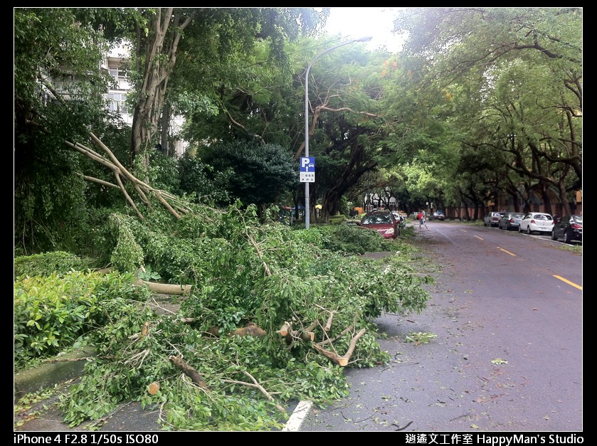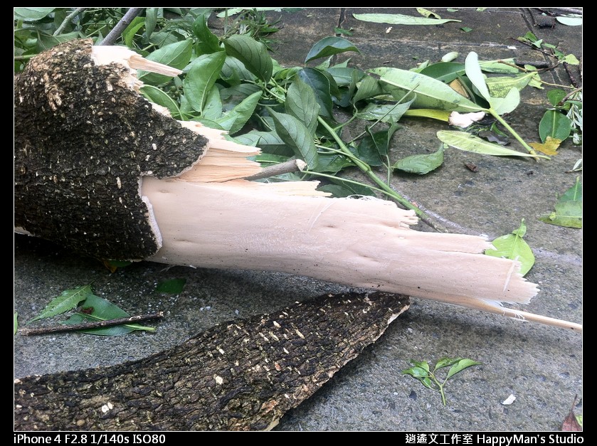 看來已經有善心人士先行整理過,把沒斷乾淨俐落的樹枝直接砍掉,還有擋在馬路上的殘枝落葉也被移到路邊。