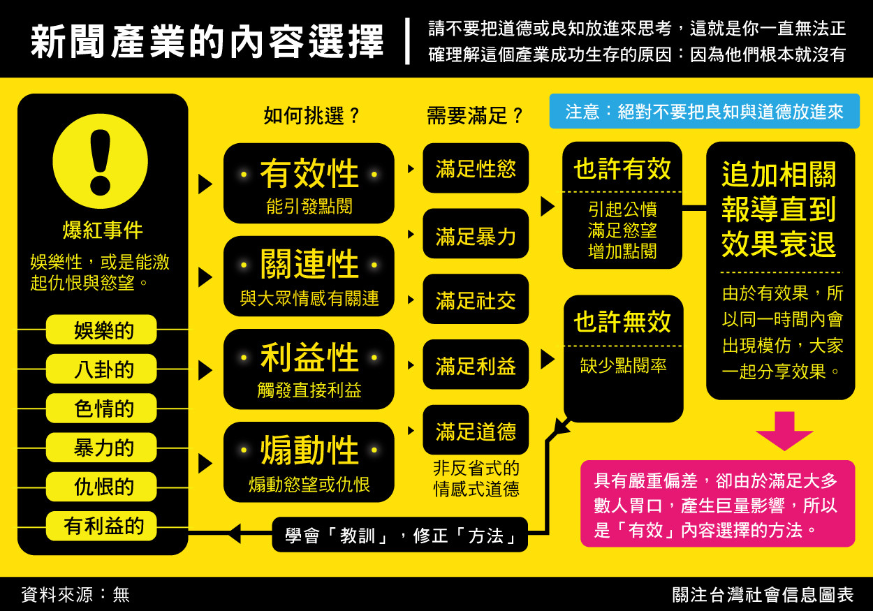 忘了看到哪篇文章,有個新聞工作者說,我們可不能怪媒體總是報導沒啥營養的新聞,因為他們只是提供我們想要的東西罷了~是因為我們的選擇,讓新聞無不充滿偏頗的報導,而且越能激發情感的越有價值!