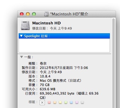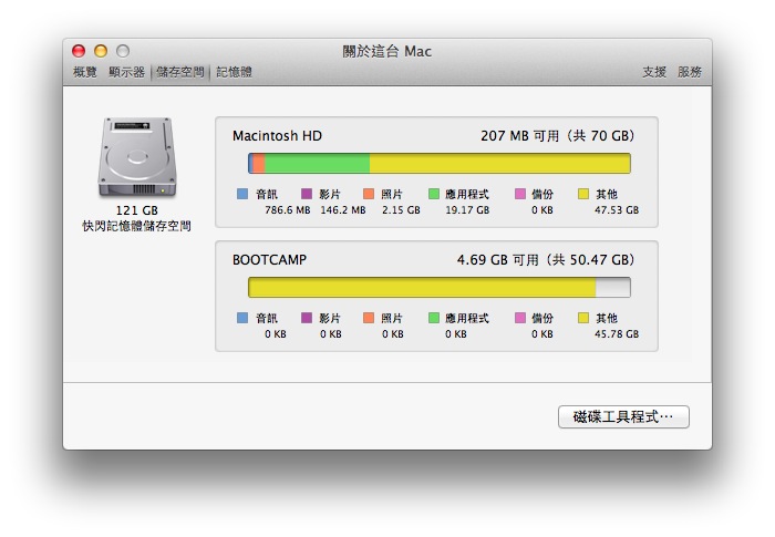 其中我把70GB割給Mac,而50GB分給Windows,已經沒有在Air存放音樂、影片、影像的我,上頭顯示的「其他」不知道為何如此龐大?