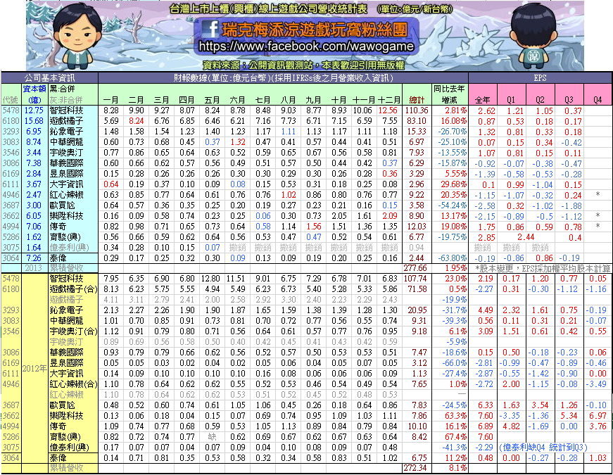時間隔得有一點久,現在才貼上2013年線上遊戲公司營收,可以先回顧2012年線上遊戲公司營收。行動遊戲越來越夯,台灣這些線上遊戲公司該有因應策略,多少可以從營收中看出吧!?