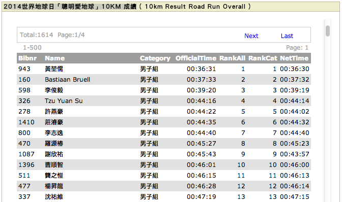 2014世界地球日-聰明愛地球路跑,跑在前十名的跑者真的超強,一定都是有練過才有今日的成績!第一名10公里只花36分鐘,這時間我最好的狀態也才跑6公里⋯⋯赫然發現我學長在清單上,沒想到他也來參加了!整個帥氣十足~